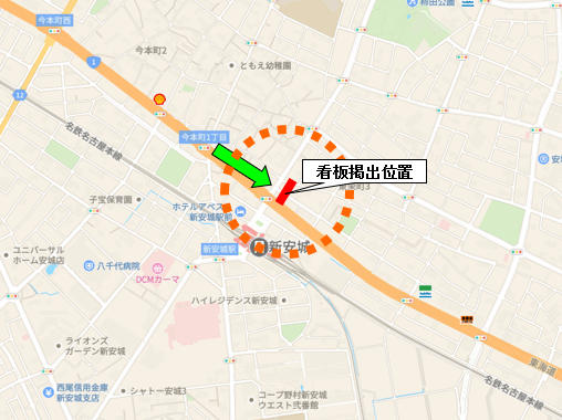 | ポイント | ★名鉄新安城駅北側の、国道1号線沿いになります。交通量が多く混雑するので宣伝と誘導に大変効果があります。 ※新規枠です。 |